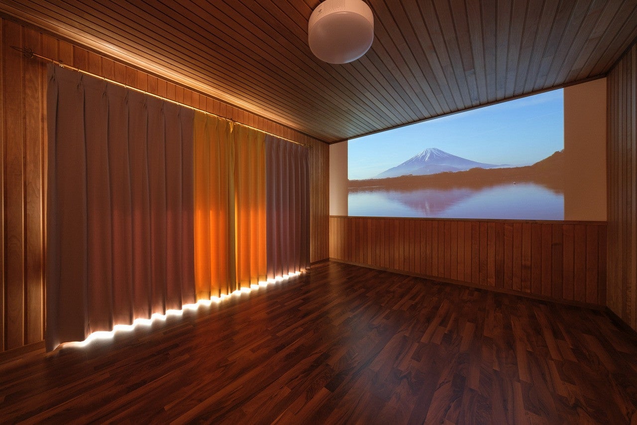 2階の一部屋は、ご家族で楽しめる団らんの空間に大変身!無垢の板張りをご採用頂き、壁面をスクリーンとして活用できるシアタールームが完成しました。