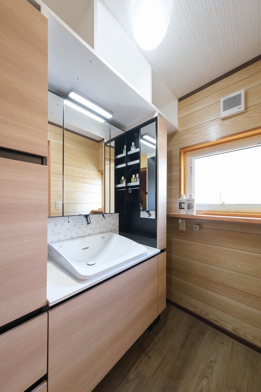 洗面化粧台の上には造り付けの棚が設置され収納力もアップしました。