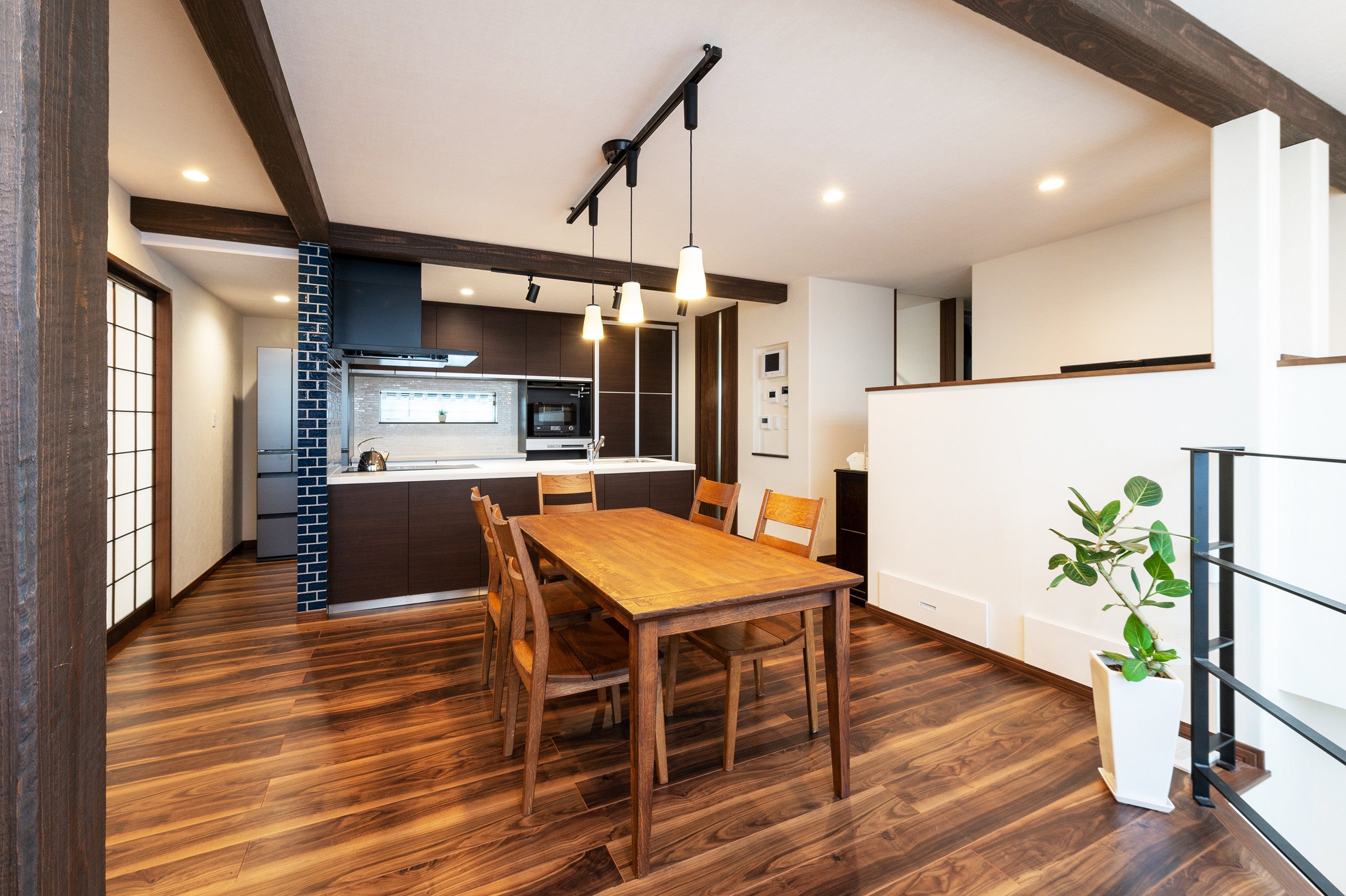 ご長男の中学進学を機に、生活拠点を空家となっていた築20年の実家へ移すことに。以前の間取りは5人で住むにはLDKが窮屈なため、居心地がよくかつ大正モダン風なインテリアにしたい、さらに家族動線に配慮し3人の子ども達を見守れる様に居間階段を付けたいとう要望をうけ、窮屈なうえ日が当たらないLDKは、バルコニーと凹部を増築して広さと採光面を改善しました。