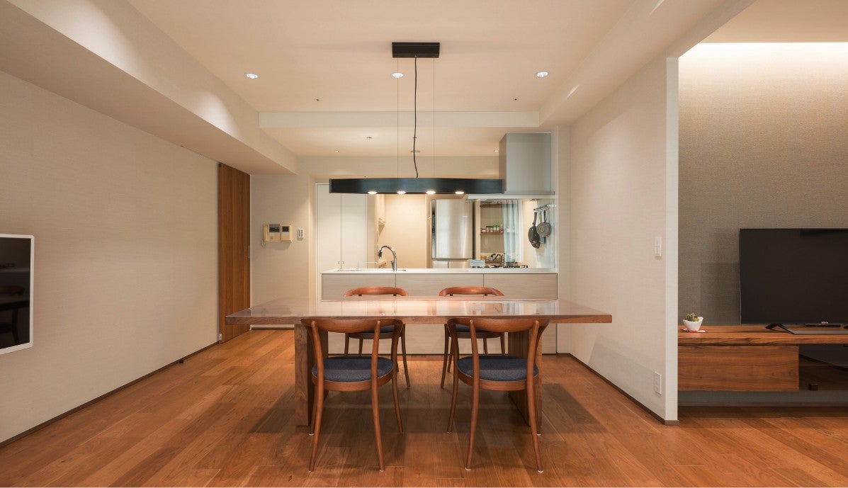 施主様お気に入りのダイニングテーブルやペンダントライトを活かす空間デザインを心掛けました。ダイニングテーブルの無垢材の色と床材や建具の色のバランスを考慮。全体的に色数は少なめでまとめました。