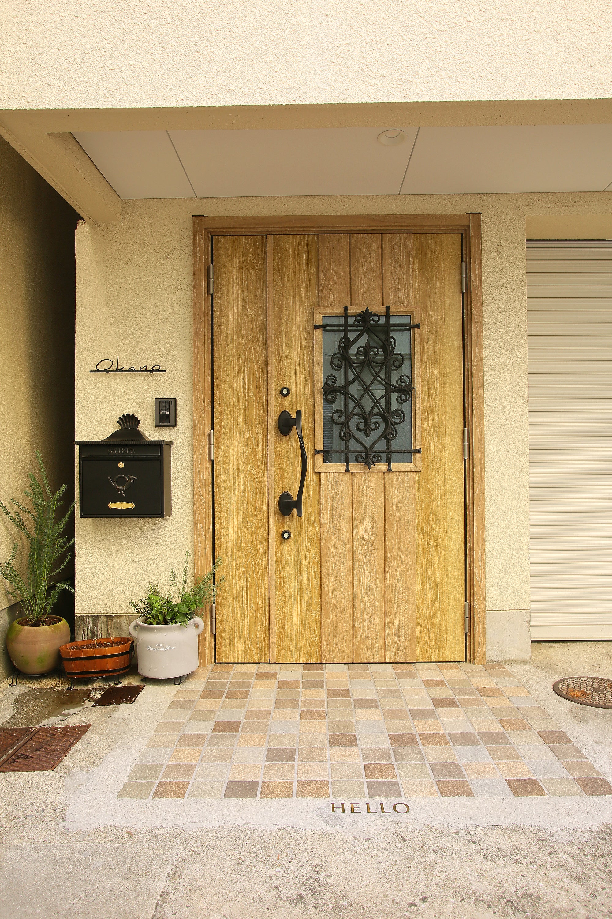ヨーロッパ風の木彫の玄関ドアと、玄関口の床タイルでまるでCAFÉのような印象に。ピンク系と茶系のランダムな床タイルが訪れる人を柔らかで明るい気持ちにさせてくれます。