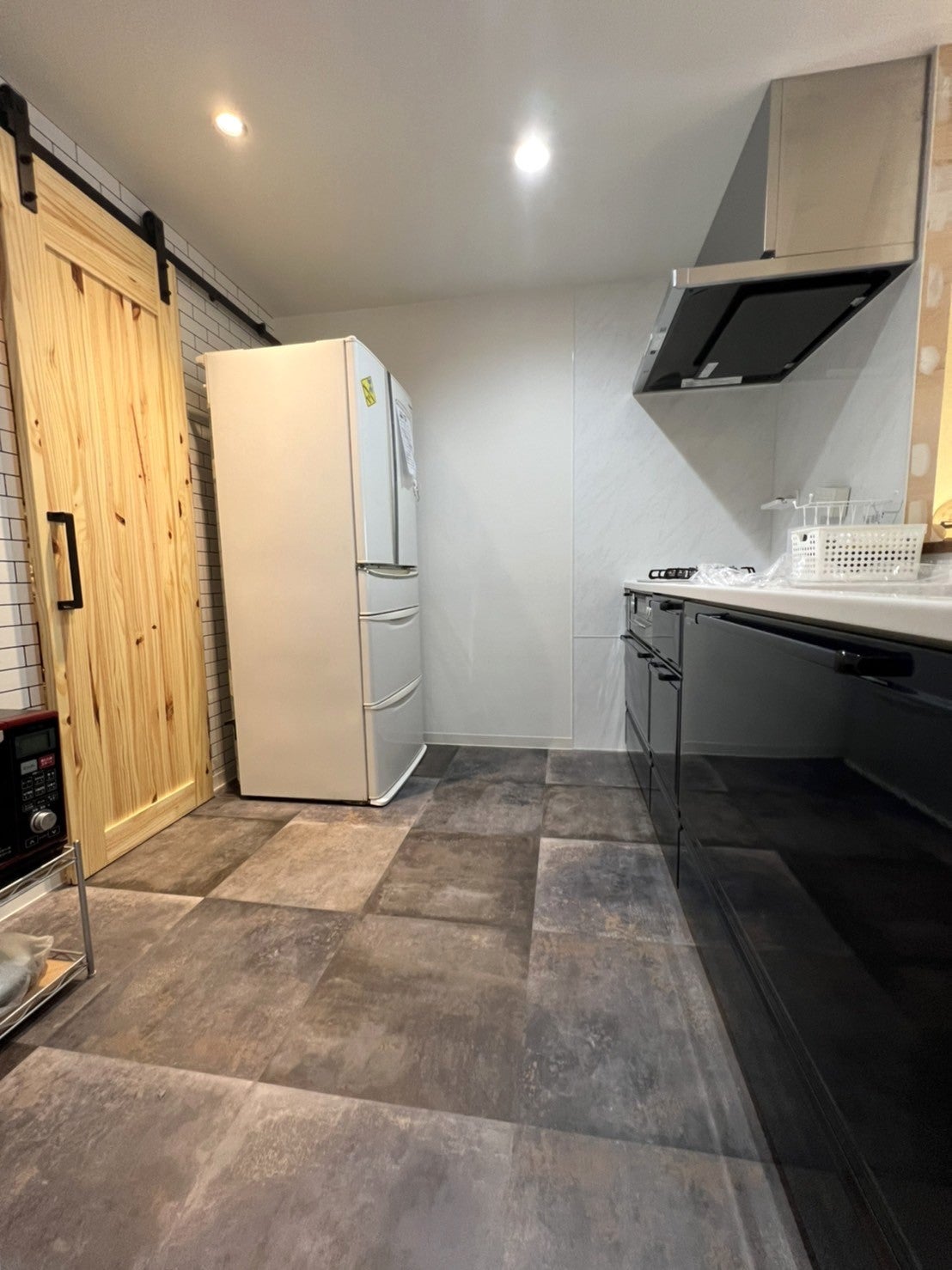 キッチンはタカラスタンダード。背面のバーンドアが素敵です!! バーンドア→スチールのレール・ローラーがむき出しになっているのが特長で、ヴィンテージ調の木製扉とよく合います。