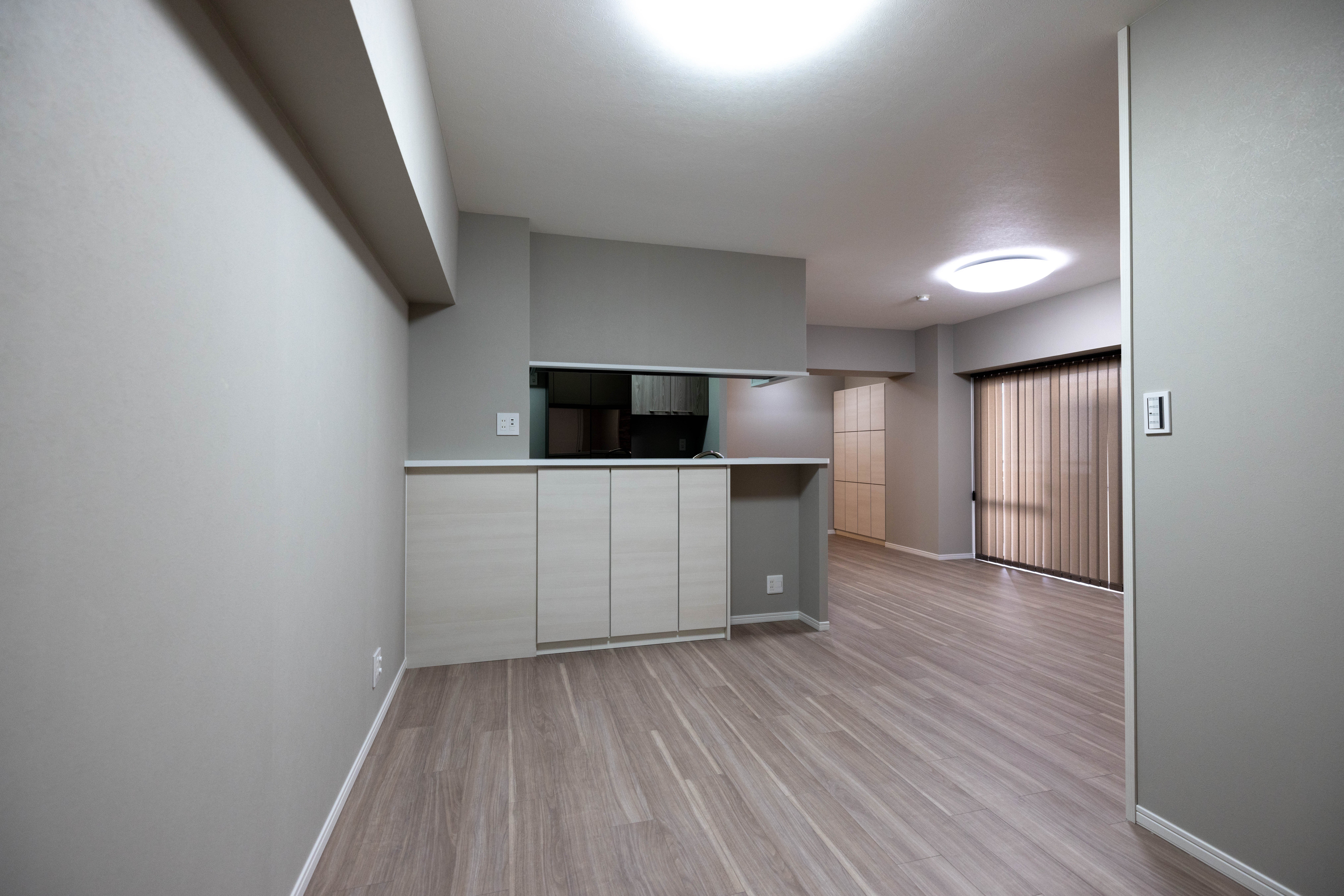 施工後の全体の様子です。 グレーを基調としたおしゃれな空間になりました。 木目調のドアがワンポイントで引き締まって見えます。