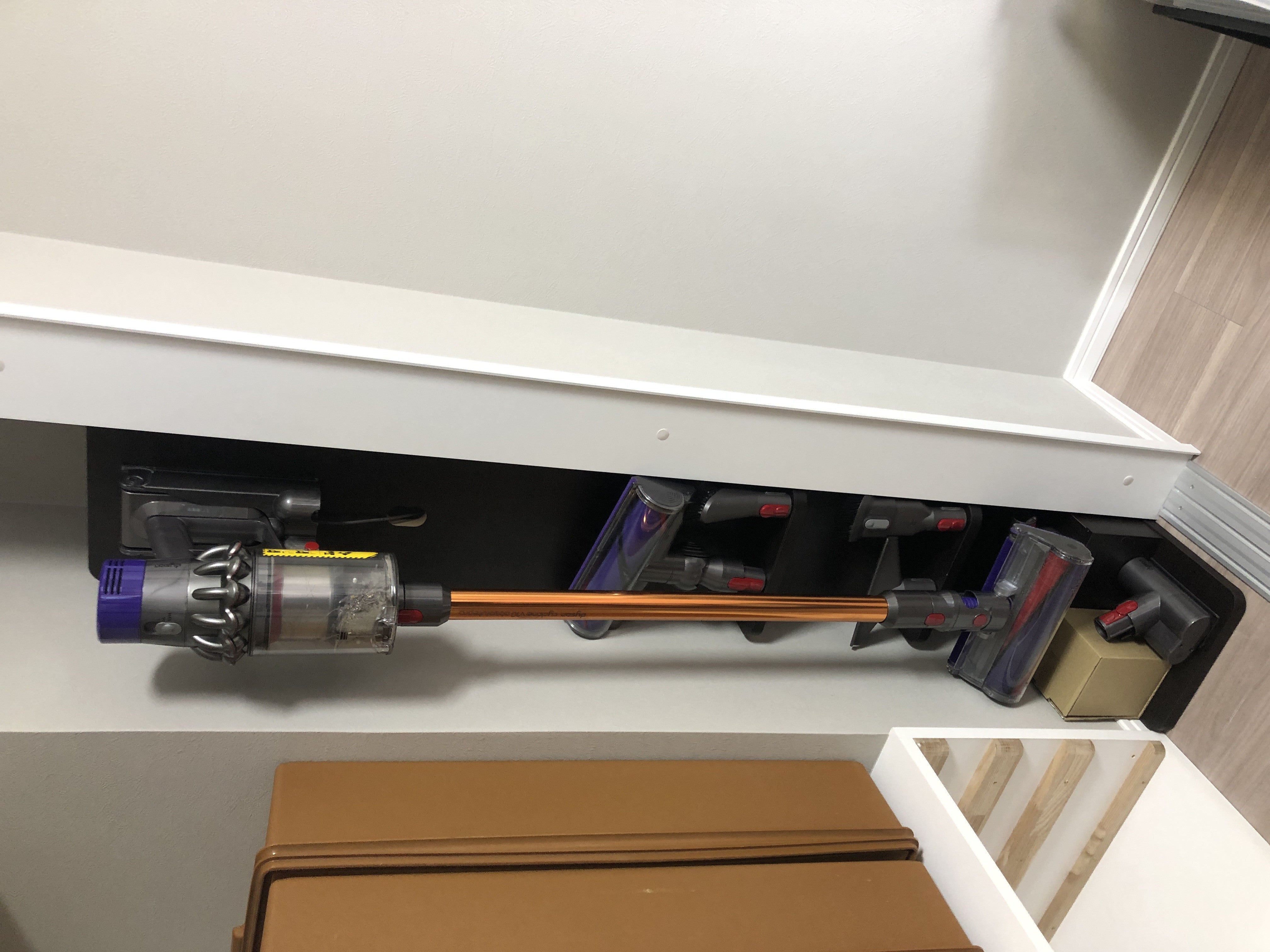 リビング収納の柱型とのデットスペースには、コンセントを設け、ダイソンの掃除機がぴったり納まるように設計いたしました。