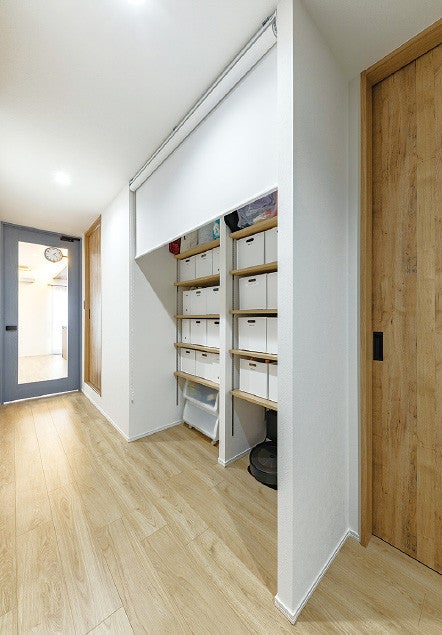 廊下の収納を拡大してすっきり分類。来客時はロールスクリーンで目隠しできるようにした